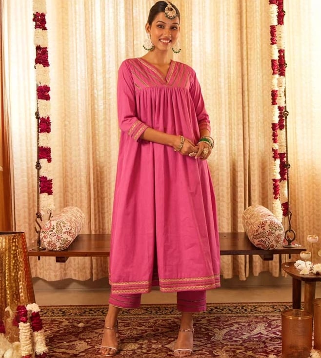 Pink Long Anarkali Kurta With Straight Pants (Set Of 2)
