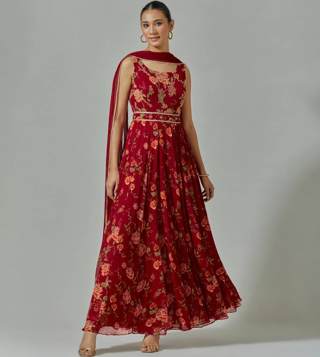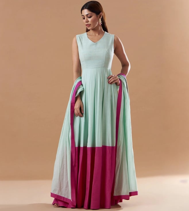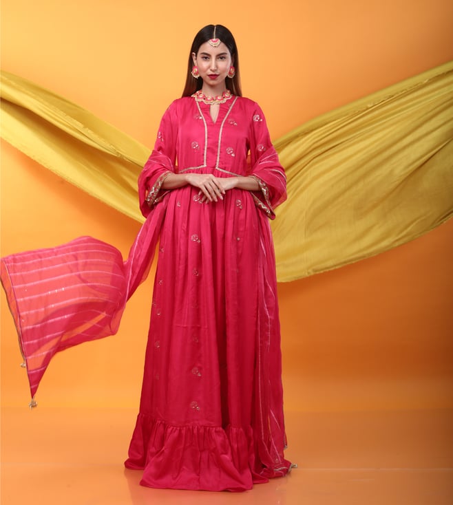 Monk & Mei Zunera Long Anarkali Kurta with Dupatta Set-Fuchsia Pink