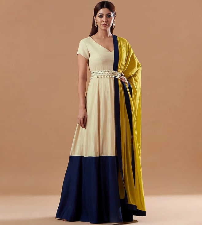 Monk & Mei Zunera Long Anarkali Kurta with Dupatta Set-Canary Yellow