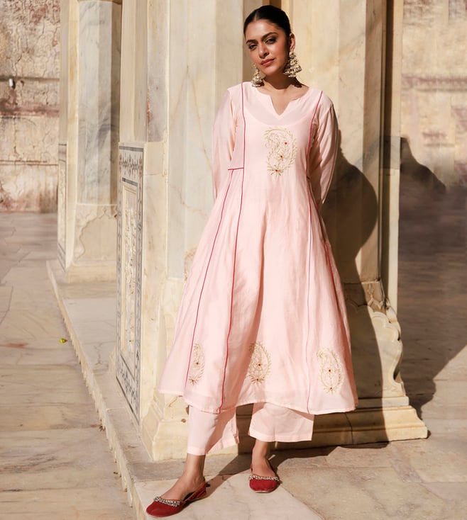 Adaa Pink White Cotton Anarkali Set Kurta With Pant And Dupatta