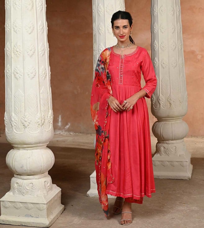 Red Sukoon Summer Hand Aari Embroidery Viscose Organza Three Anarali Kurta with Palazzo and Dupatta