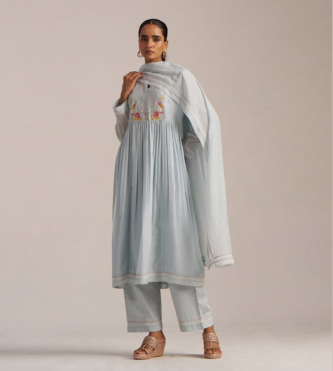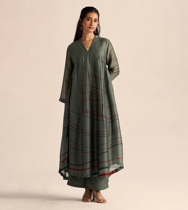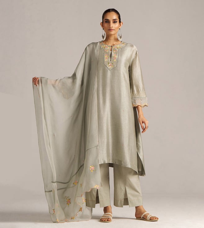 Seagrass Grey Bagh Raw Silk A-Line Kurta & Pant Set With Dupatta