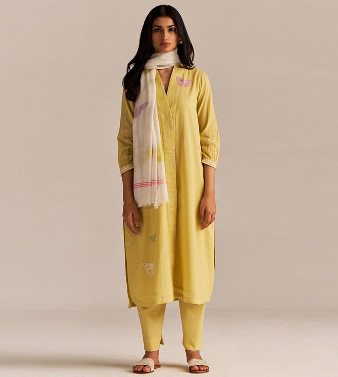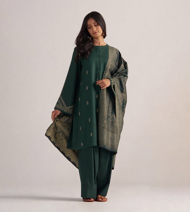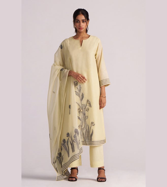 Pistachio Woven Mul Cotton A-Line Kurta & Pant Set With Dupatta