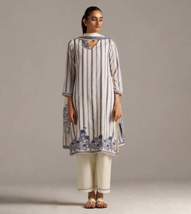 Off-White & Blue Woven-Chanderi Striped Kurta & Pant Set With Dupatta