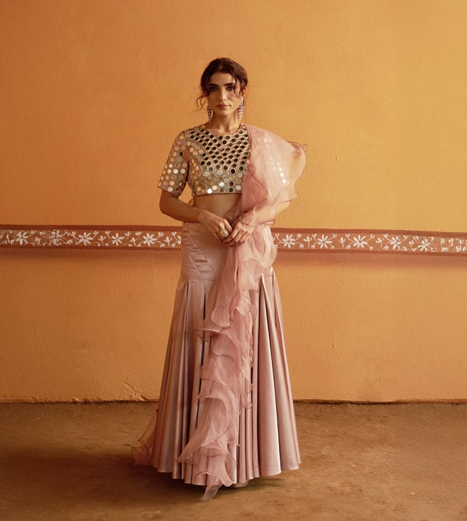 Hand-Embroidered Mirror Work Blouse With Blush Pink Kalidar Lehenga & Ruffle Dupatta