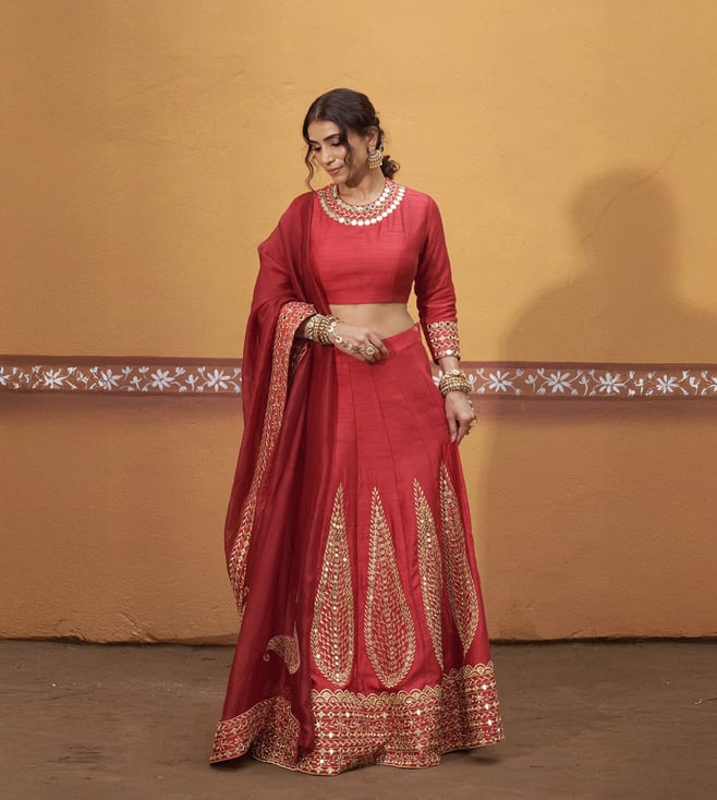 Soft Gold & Red Kashvi Banarasi Hand Embroidered Silk Tissue Lehenga and Blouse