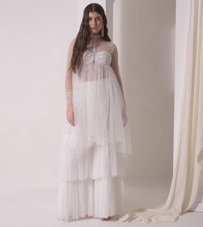 Ivory & Cerulean Tarang Ombre Beaded Bralette Tunic And Tiered Sharara