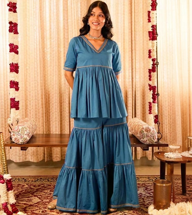 Blue Peplum Short Kurta With Tiered Sharara (Set Of 2)