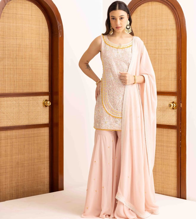 Rose Pink Georgette Regular Fit Kurta with Sharara and Dupatta