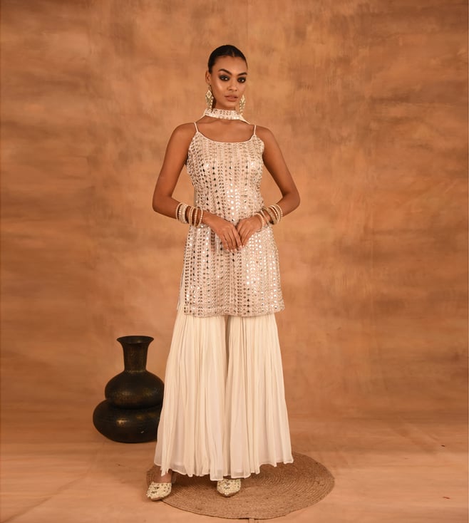 White FOIL Embellished Regular Fit Sharara Suit Set