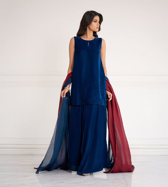 Persian Blue Block Printed Chanderi Kurta With Pant And Dupatta