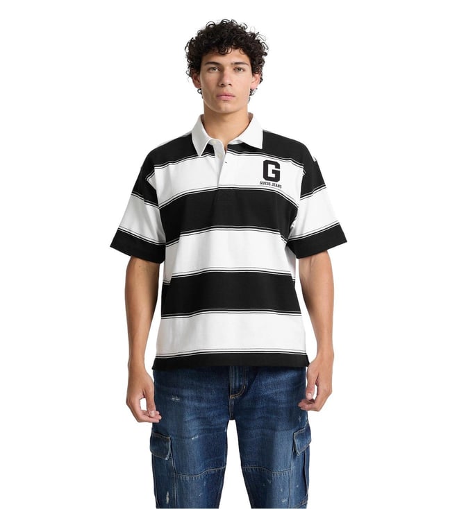 Rugby Jet Black & White Regular Fit Striped Polo T-Shirt