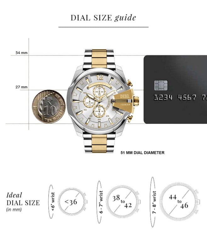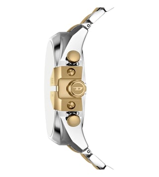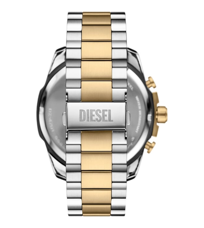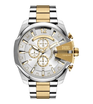 Elevate your style with the Diesel Mega Chief Quartz Chronograph Mens Watch. This stunning timepiece boasts a 51mm two-tone sunray and brushed dial, showcasing a sleek and modern design. The chronograph movement allows for precision timekeeping, while the gold and silver stainless steel bracelet adds a touch of luxury. Perfect for the man who values both style and functionality, this watch is sure to make a statement wherever you go. Upgrade your accessories game with the Diesel Mega Chief watch today.