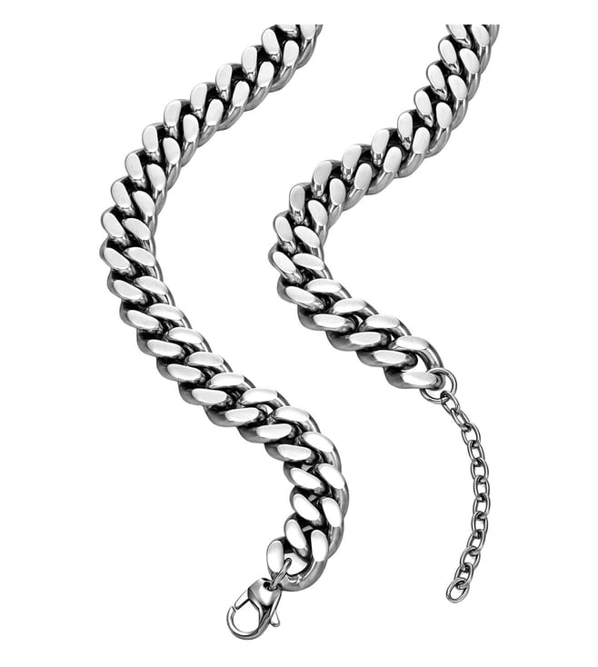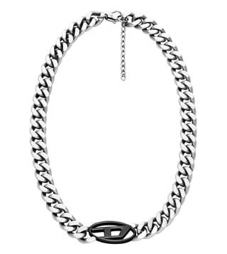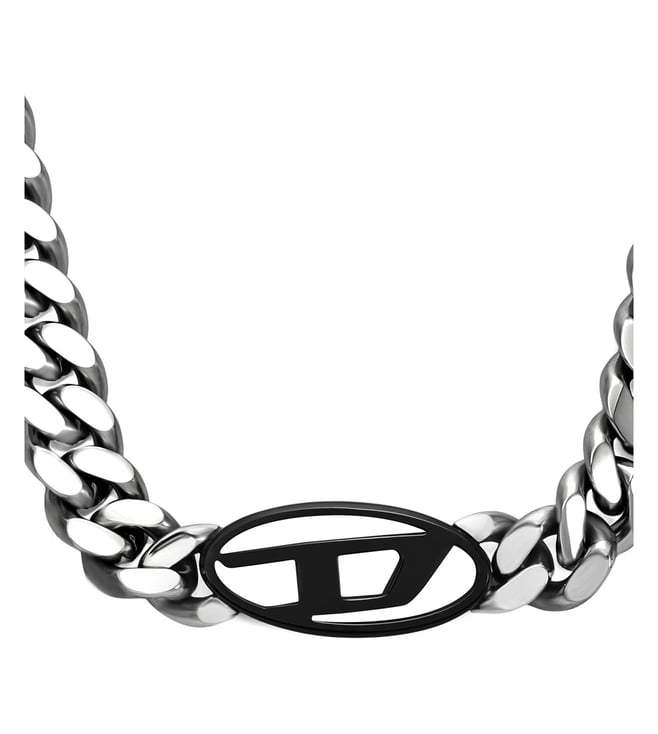 Diesel's two-tone chain necklace features a sleek stainless steel silver curb chain paired with the iconic Oval D logo in bold black. This statement accessory combines industrial edge with signature branding for a striking, contemporary look.