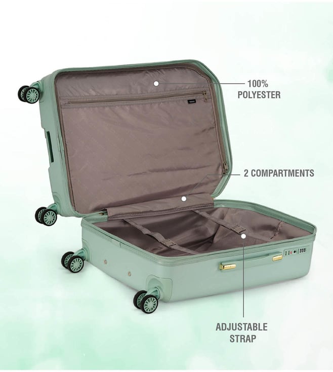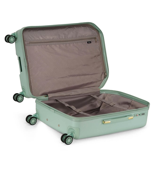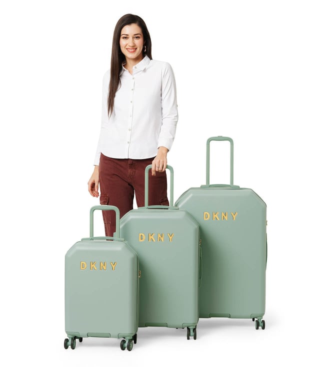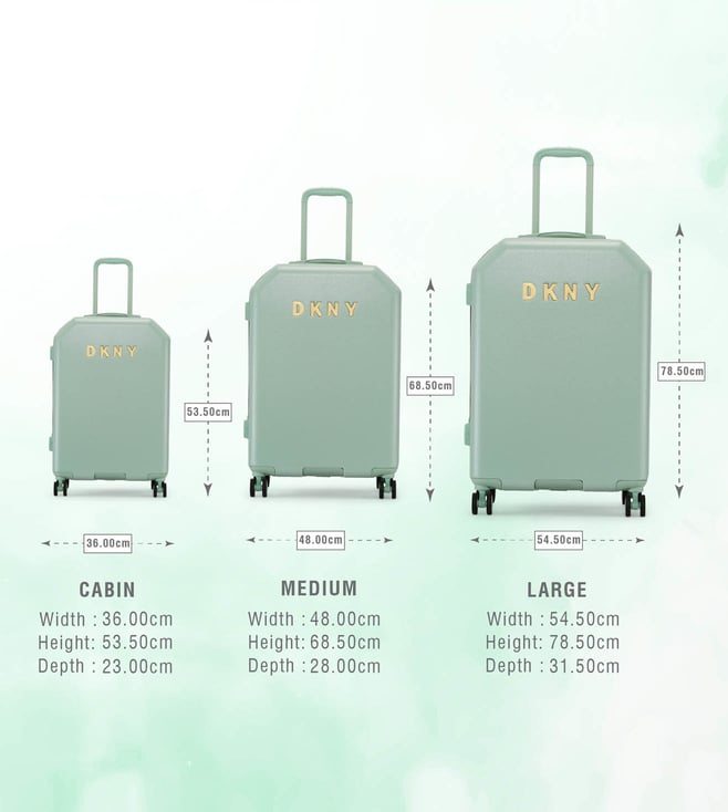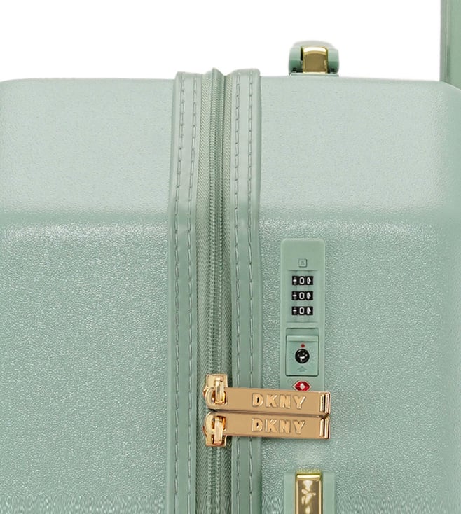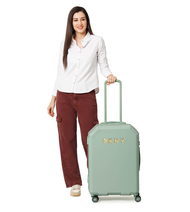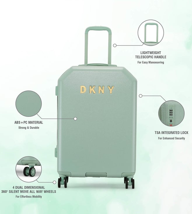 The modern, confident, and iconic mint sage medium checked luggage from ALLURE range from the house of Dkny. Engage your confidence and elevate your style and impact with this designer luggage. The body is of ABS plus PC with metal logo embossed, smooth movements, polyester material, tenaciously tough and highly desirable. The grips have luxurious comfort grips, security zippers, and is water resistant. The 360-degree all-way wheels ensure gentle and silent moves as a breeze. Create an aura of your presence.