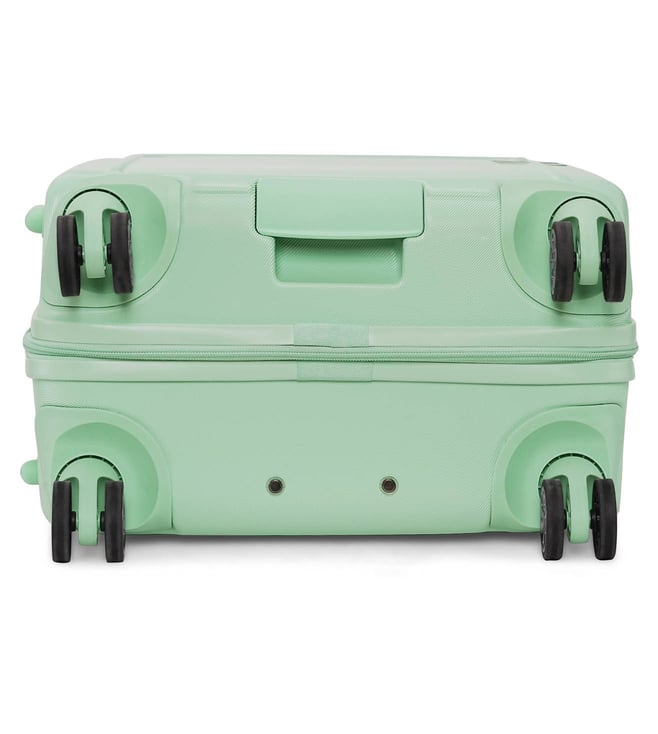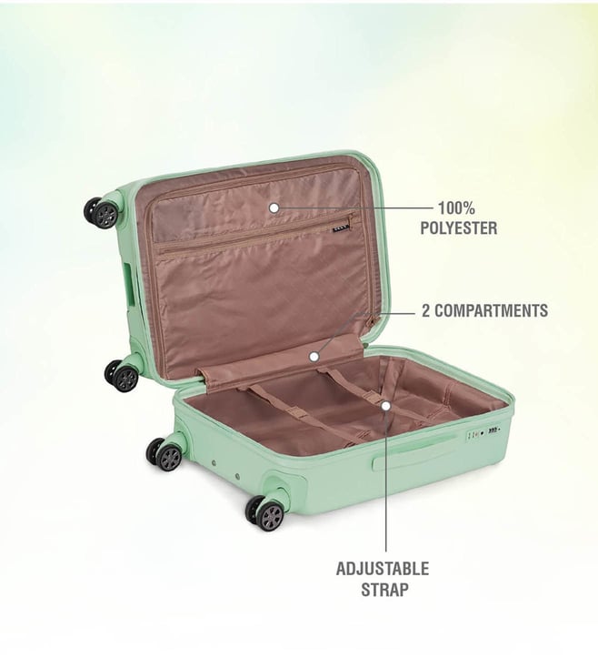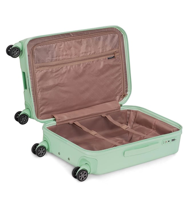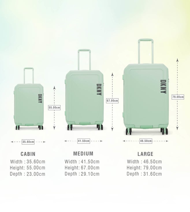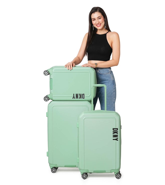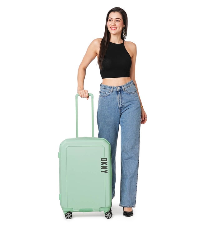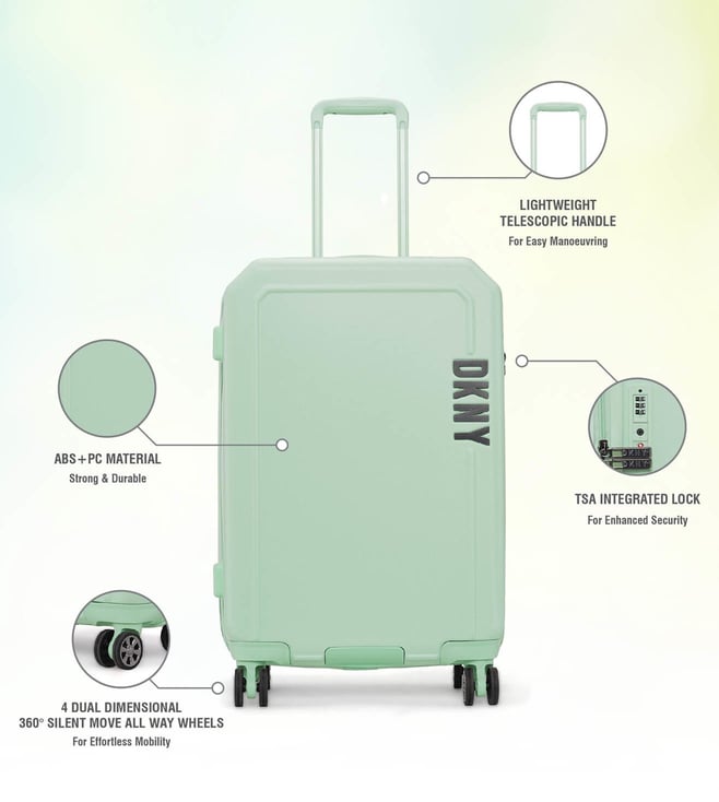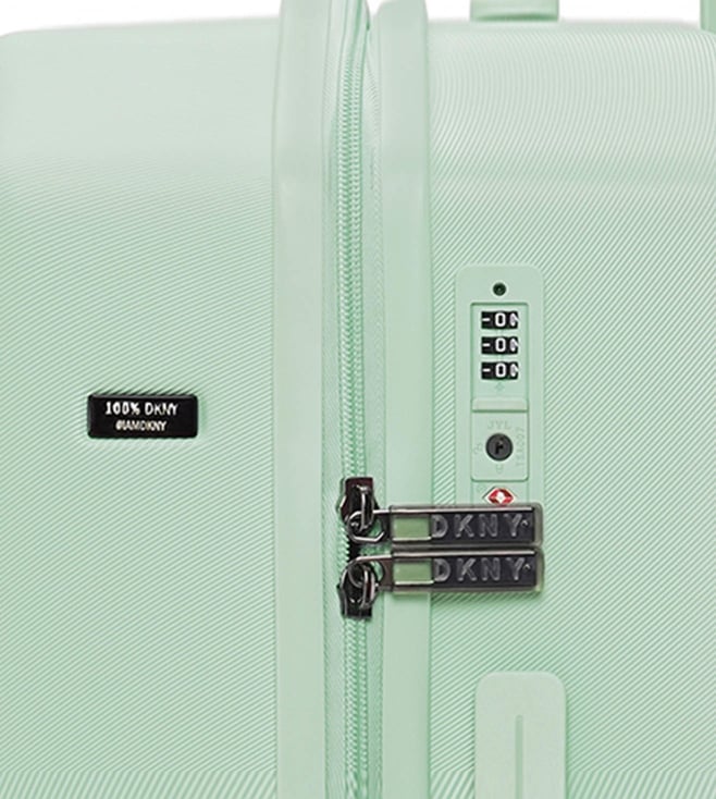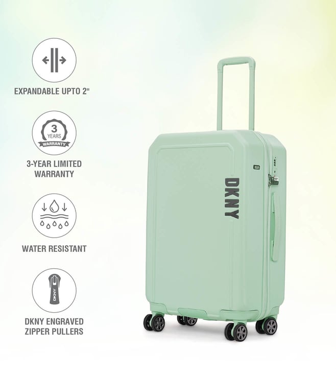 The modern, confident, and iconic mint sage cabin checked luggage from CLEAN CUT range from the house of Dkny. Engage your confidence and elevate your style and impact with this designer luggage. The body is of ABS twill textured, logo embossed, smooth movements, polyester material, tenaciously tough and highly desirable. The grips have luxurious comfort grips, security zippers, and is water resistant. The 360-degree all-way wheels ensure gentle and silent moves as a breeze. Create an aura of your presence.