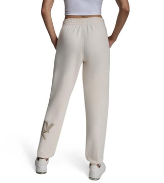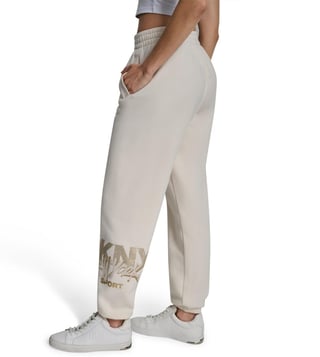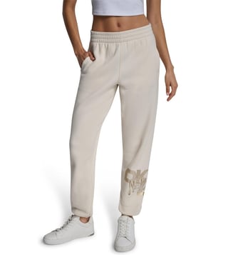 Women's cream sweat pants add a chic look to your casual wear. Mindfully crafted with 60% cotton and 40% poly blend. Here you will have a solid base complemented with a placement print. The ribbed hemline, and drawstring waist provides a snug-fit. It has a stretchable fabric ensuring all-day comfort, and making them perfect pick casual outings.