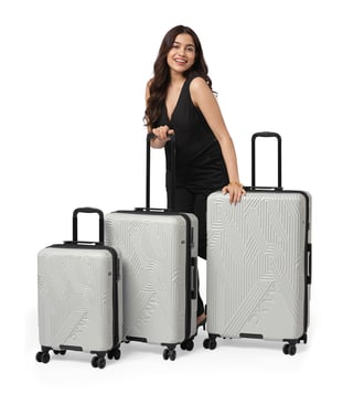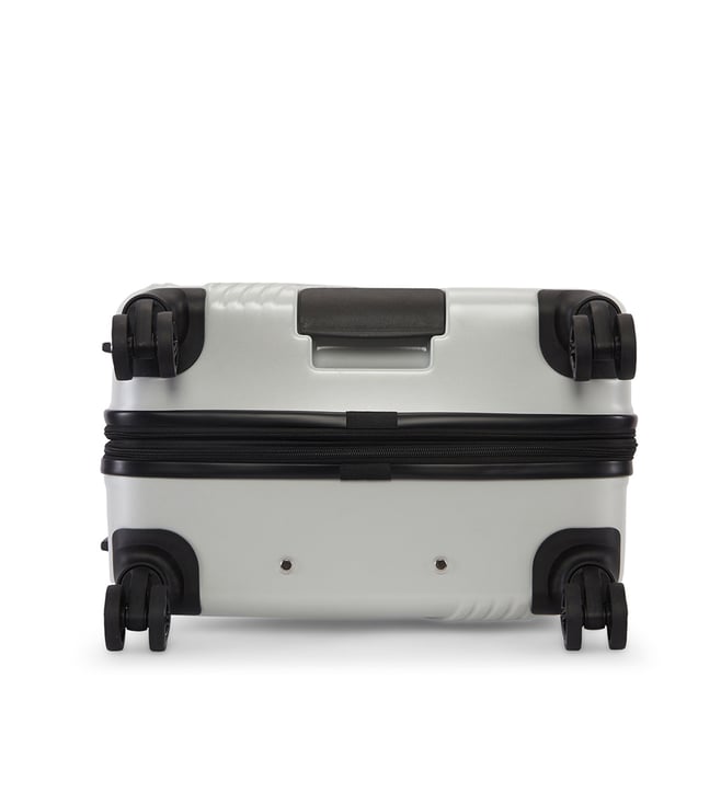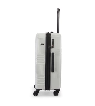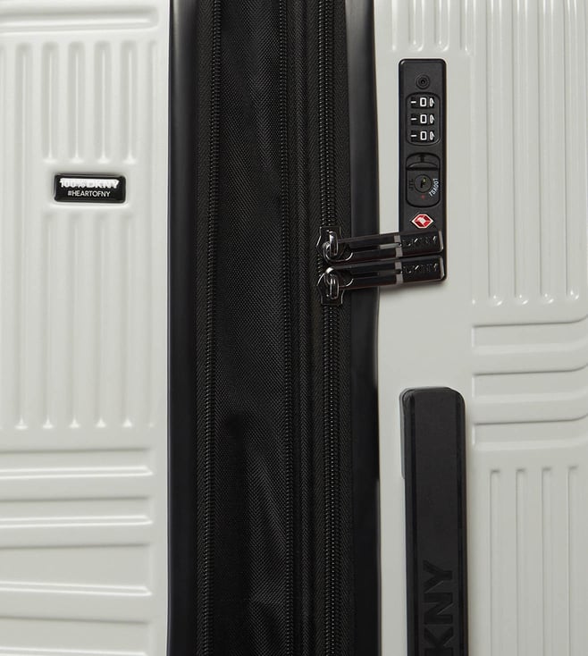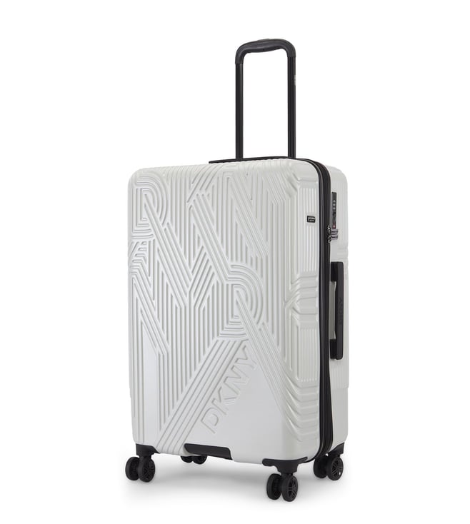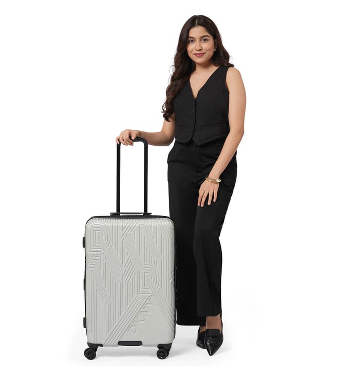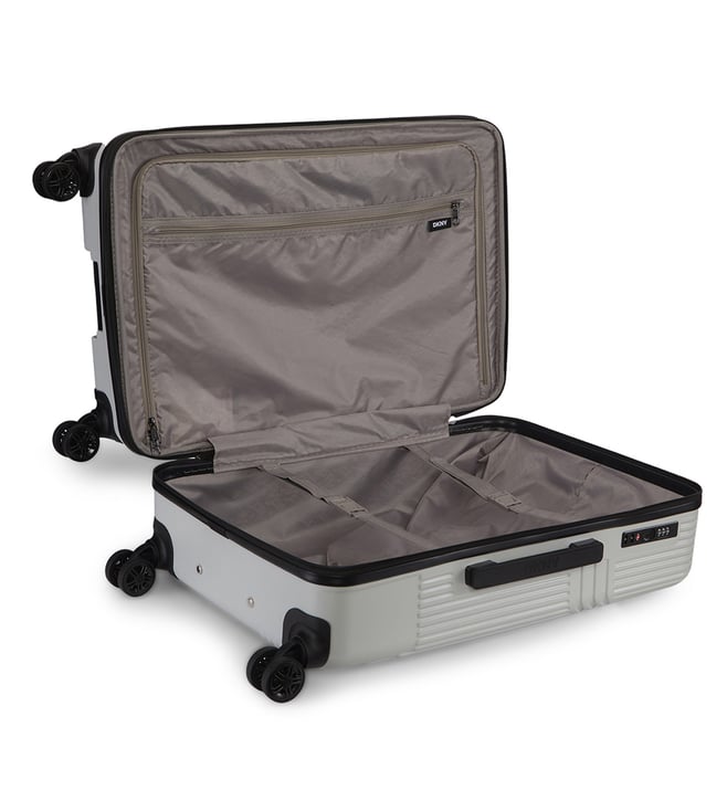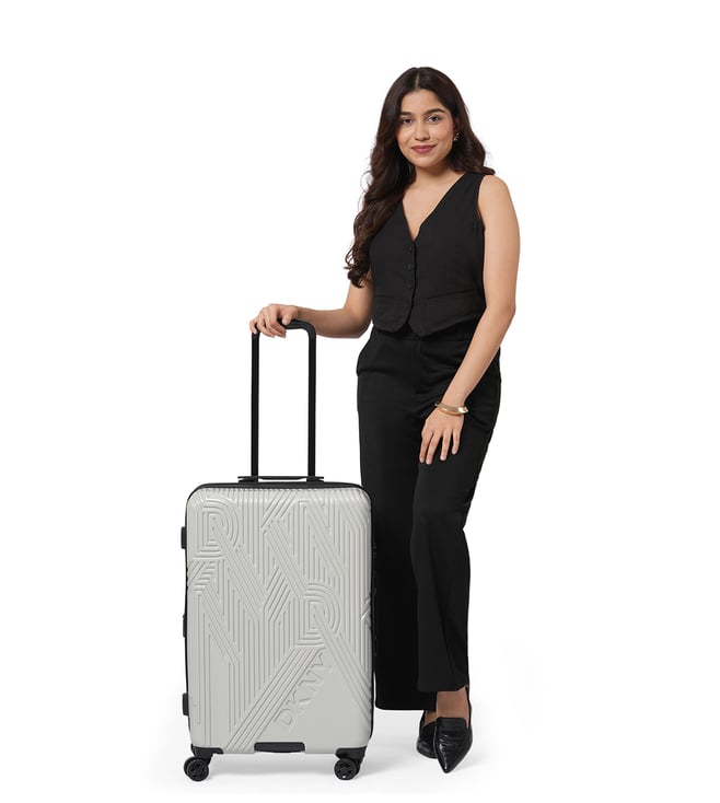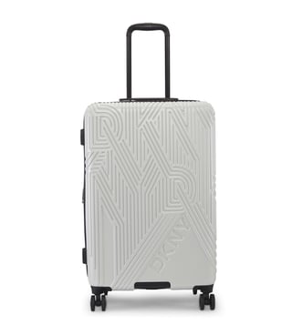The Dkny city scape 27 inches medium hard luggage in ice grey is a perfect blend of contemporary style and practical functionality, designed for travellers who seek both sophistication and durability. This medium-sized suitcase is crafted from high-quality abs pc film, ensuring a sturdy and resilient exterior that withstands the rigors of travel while maintaining a sleek look. Its frosted texture paired with the embossed Dkny logo gives it a refined, premium appeal. The interior is lined with 100 percent polyester, offering a soft, protective layer for your belongings.