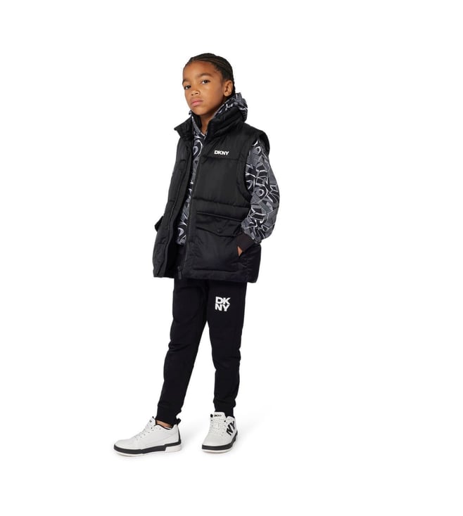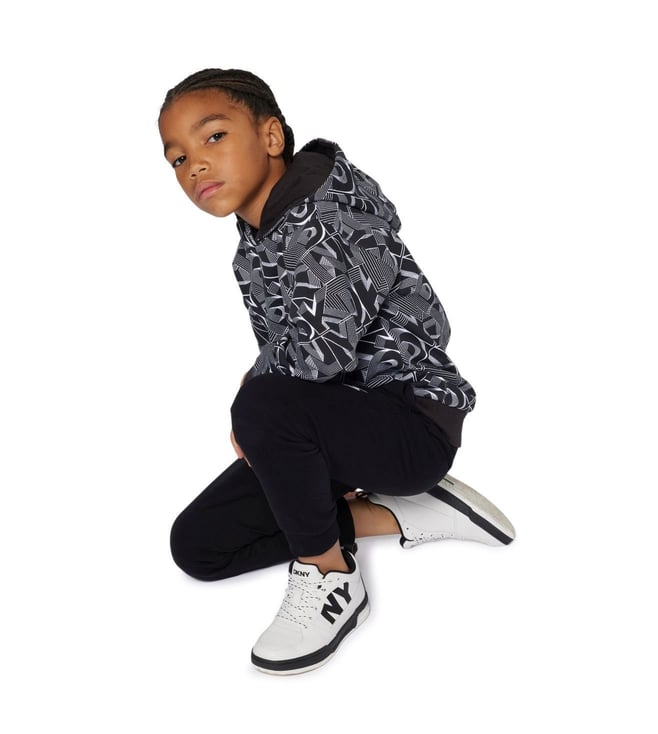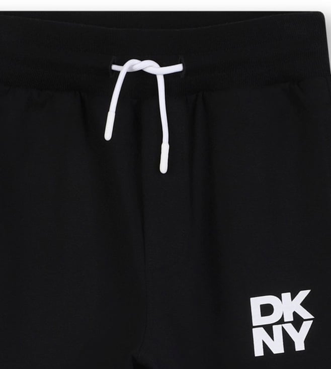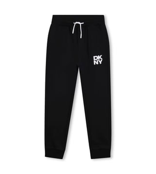 Get your little one ready for playtime in style with the Dkny Kids Black Printed Jogger. These trendy joggers feature a sleek black color with a fun printed design, perfect for adding a pop of personality to any outfit. Made with high-quality materials, these joggers are durable and comfortable for all-day wear. The elastic waistband ensures a perfect fit, while the relaxed fit allows for easy movement. Whether they're running around the playground or lounging at home, these joggers are a must-have for any stylish kid's wardrobe.