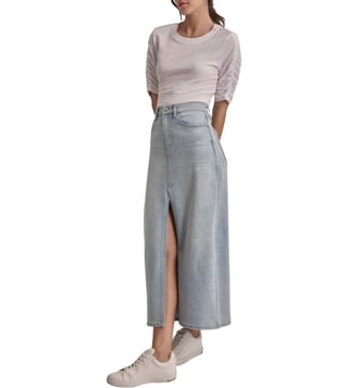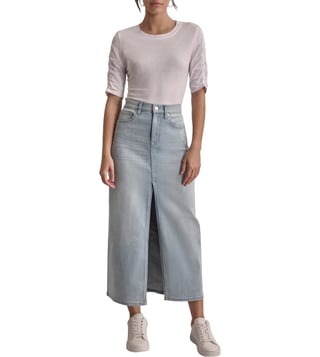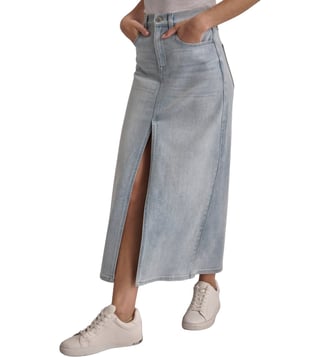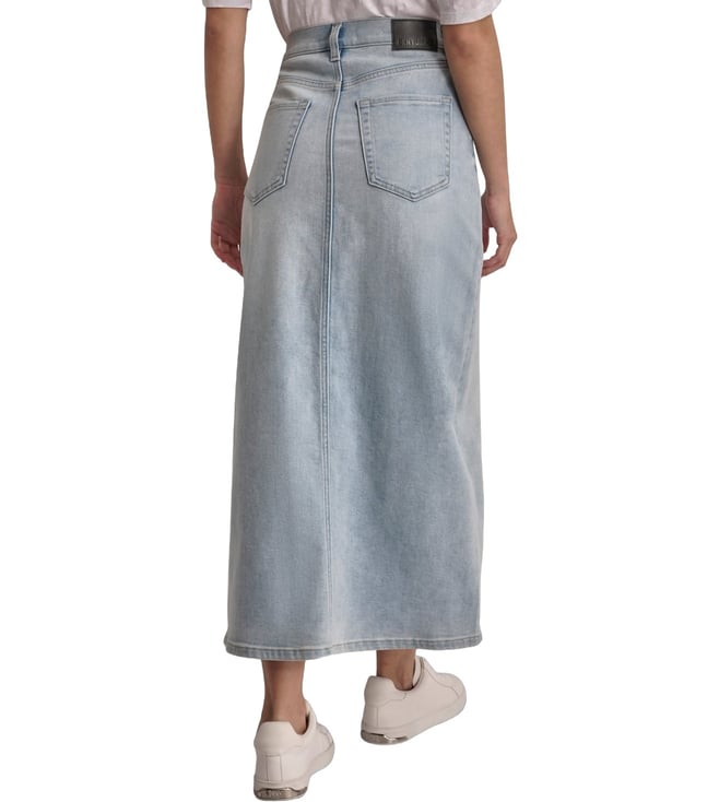 Elevate your casual chic style with the DKNY Light Blue Straight Fit Denim Skirt. Crafted from premium denim, this skirt offers a flattering straight fit that hugs your curves in all the right places. The light blue wash adds a touch of laid-back sophistication, perfect for effortlessly transitioning from day to night. Pair it with a crisp white blouse for a timeless look, or a graphic tee for a more edgy vibe. Whether you're running errands or heading out for a night on the town, this denim skirt is the perfect versatile piece for any occasion.