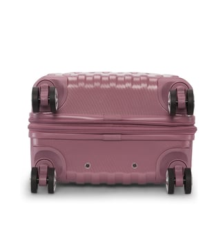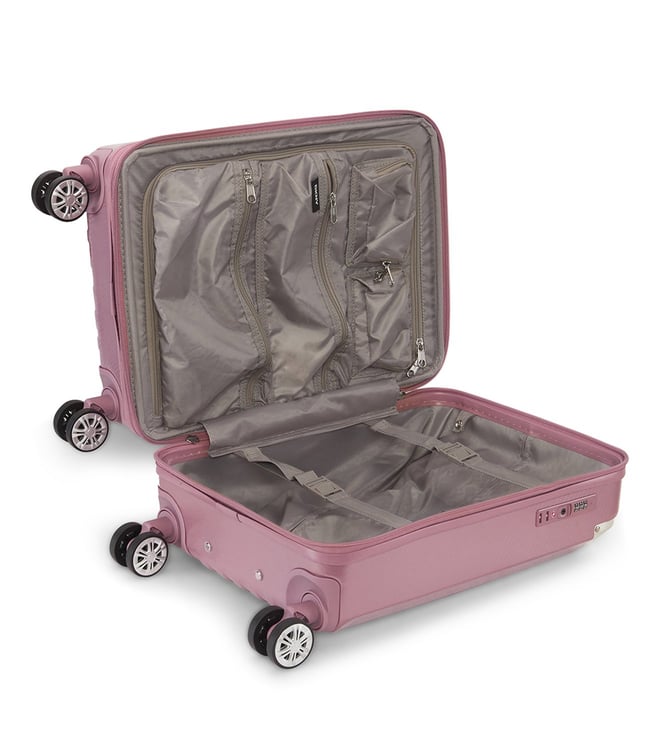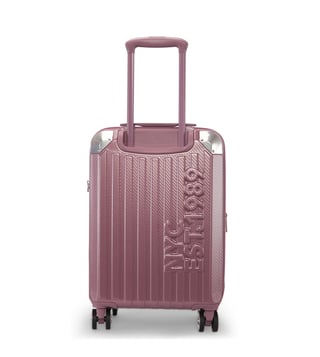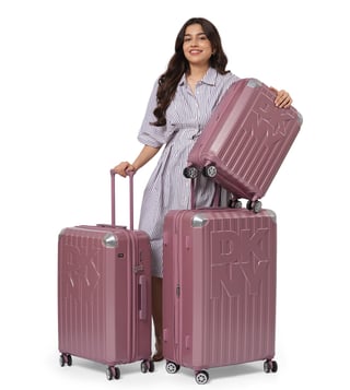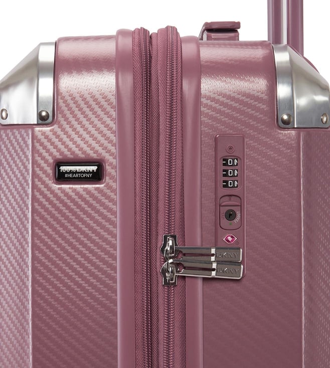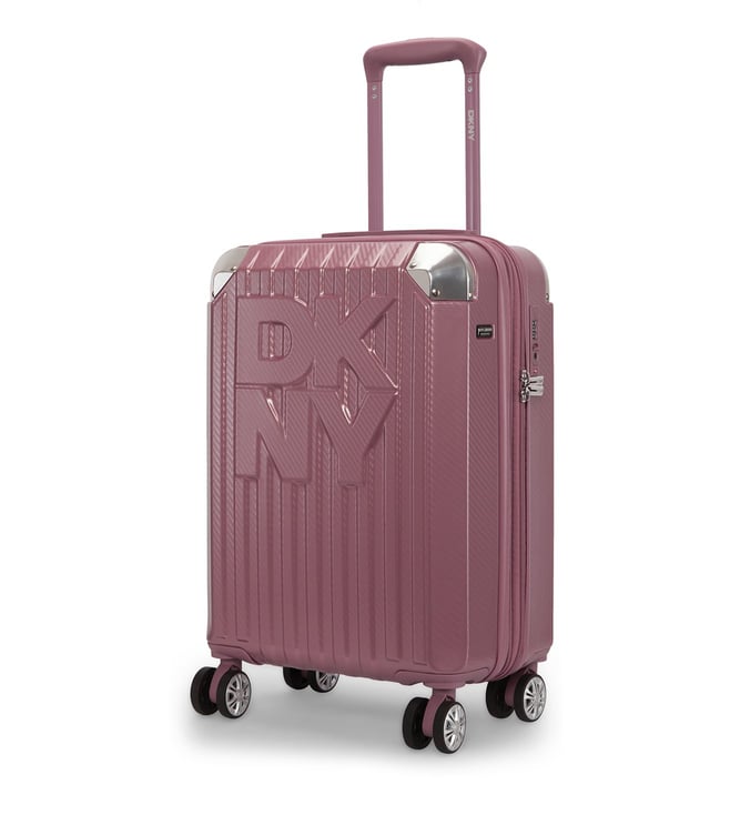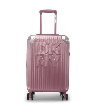 The Dkny stack logo 22 inches cabin luggage in eye-catching metallic pink is a bold and stylish travel essential, designed for both men and women. Made from durable abs with a pc film finish, this hard-shell luggage features a refined twill weave texture and a distinctive embossed Dkny logo, adding a modern and luxurious touch to your travels. The spacious interior is lined with 100 percent polyester and offers two compartments to help keep your items organized.