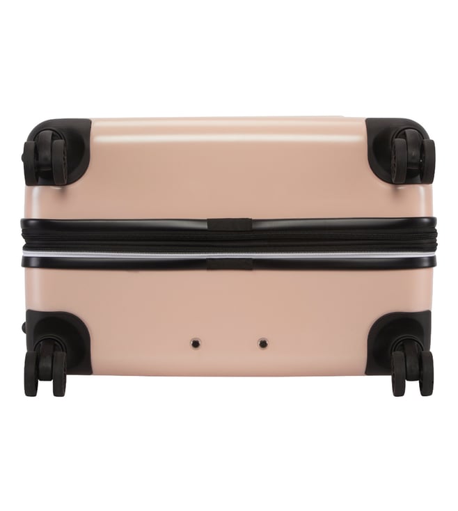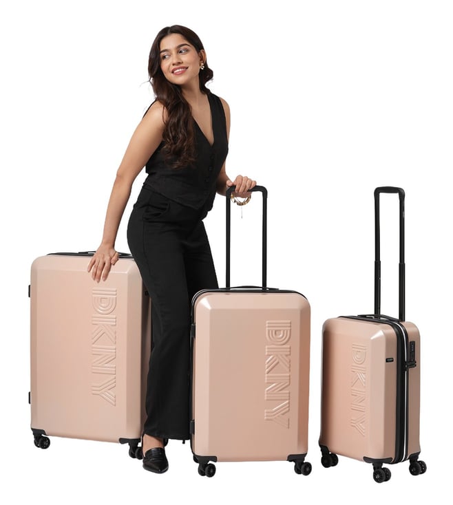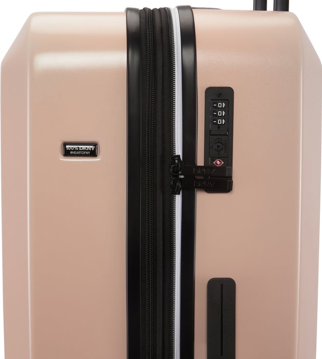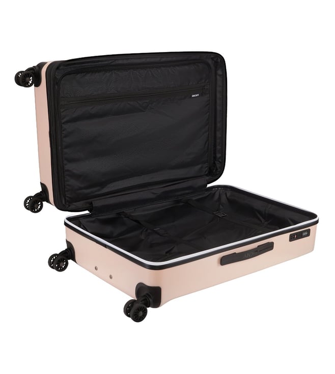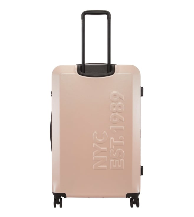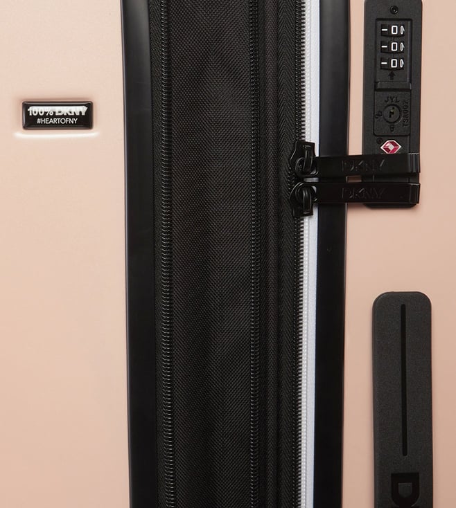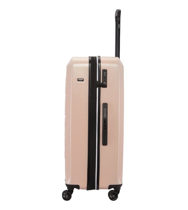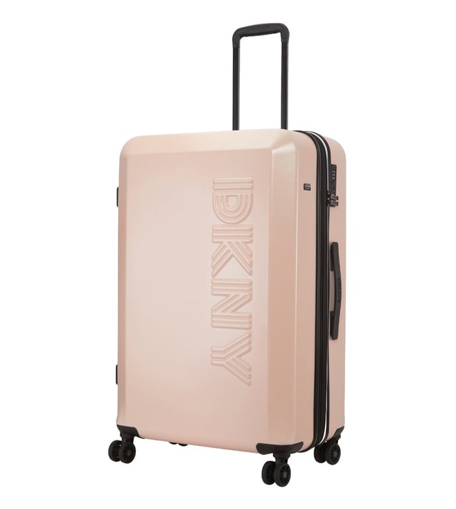 The Dkny beveled range 31 inches large hard luggage in pale peach offers a perfect blend of durability and sophistication. Crafted from ABS PC film, this large luggage ensures superior protection for your belongings. The interior is made from 100 percent polyester for strength and smooth organization. With its unisex design, it suits every traveller, while the frosted texture and embossed logo add a touch of elegance. The luggage features 8 wheels for smooth and effortless movement, and the integrated tsa lock ensures extra security.