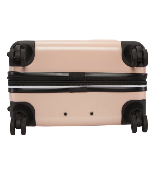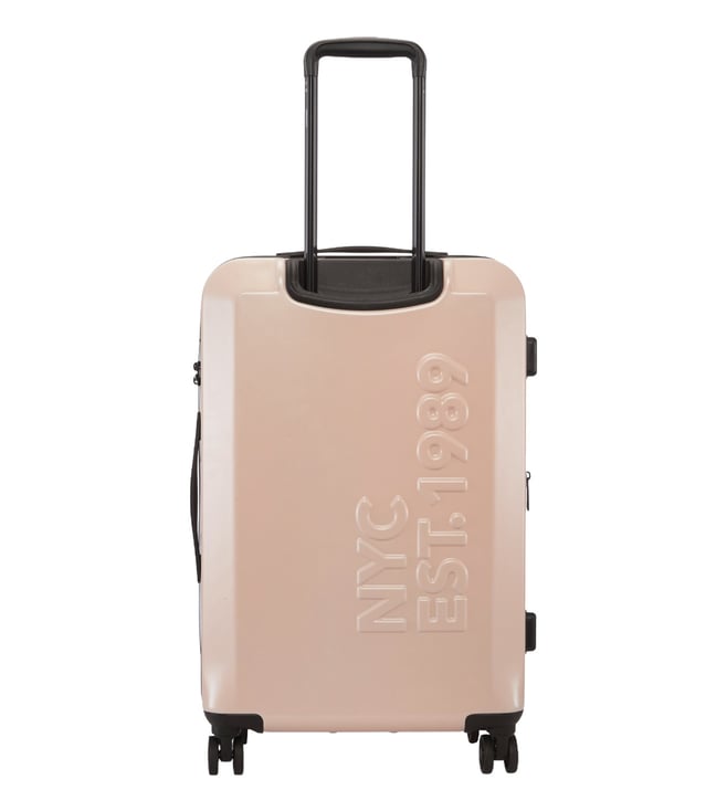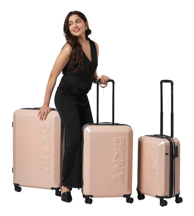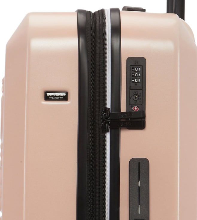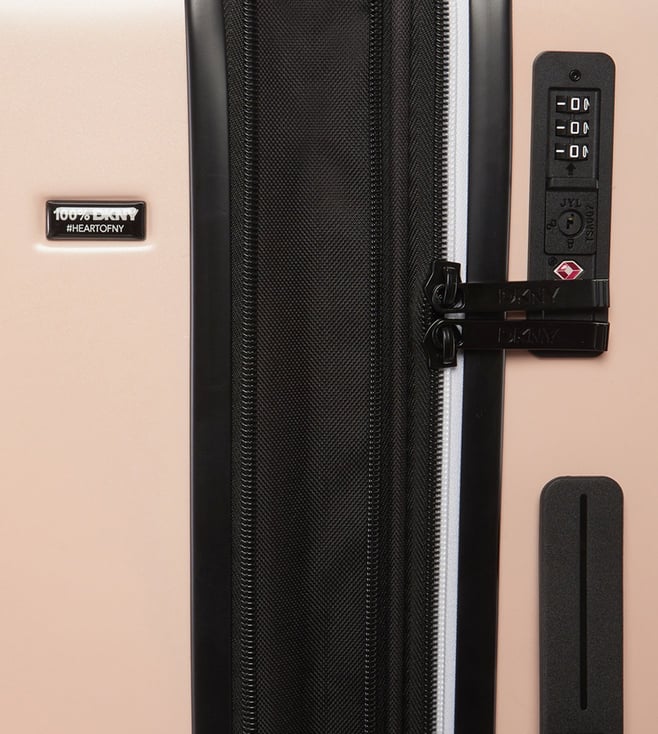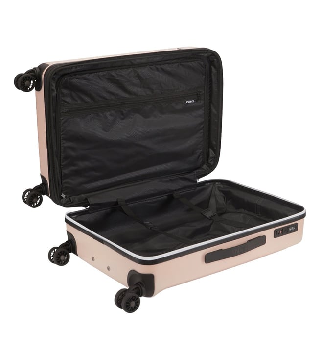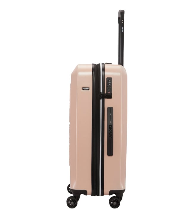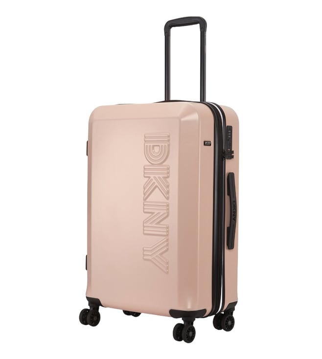 The Dkny beveled range 27 inches medium luggage in pale peach combines elegance with practicality. Made from durable ABS PC film, this hard-shell luggage offers superior protection while maintaining a stylish, frosted texture. The 100 percent polyester interior ensures smooth organization and durability, while the unisex design makes it perfect for anyone. Equipped with 8 wheels for smooth movement, it includes an integrated tsa lock for extra security. The expandable feature allows up to 5cm of additional packing space, and the luggage is designed with 2 compartments.