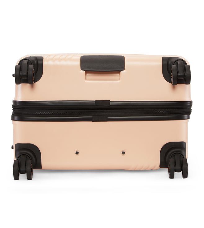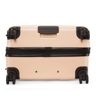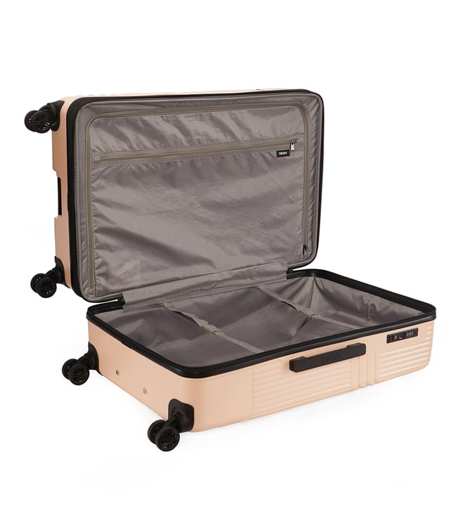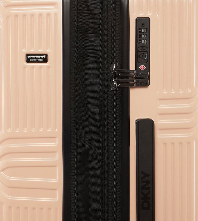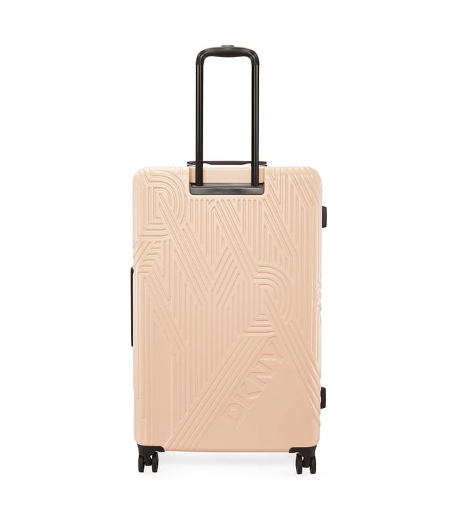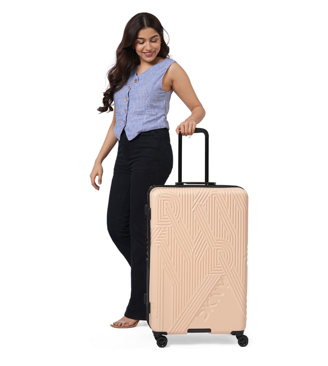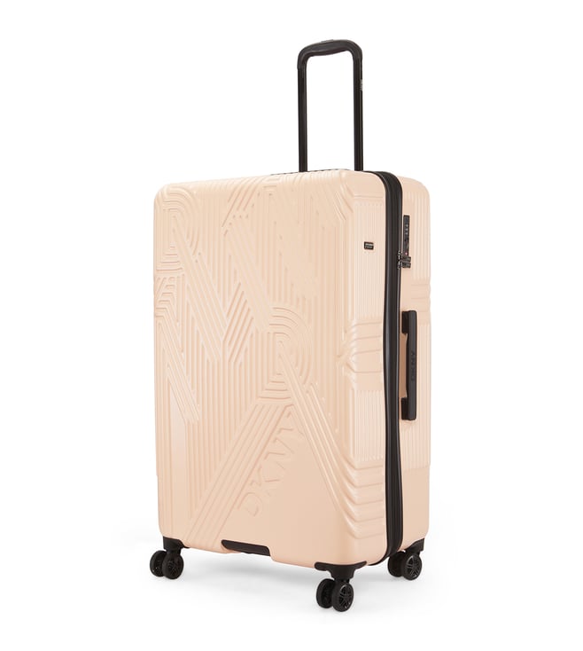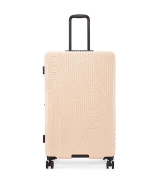 The Dkny city scape 31 inches large hard luggage in pale peach is a sophisticated and spacious travel essential designed to meet the demands of extended trips while maintaining a refined and modern look. Crafted from premium abs pc film, this hard-shell suitcase provides excellent durability and impact resistance, making it perfect for frequent travellers. The interior is lined with 100 percent polyester, offering a soft, protective environment for your belongings. A frosted texture finish paired with a distinctive embossed Dkny logo gives it a stylish edge.