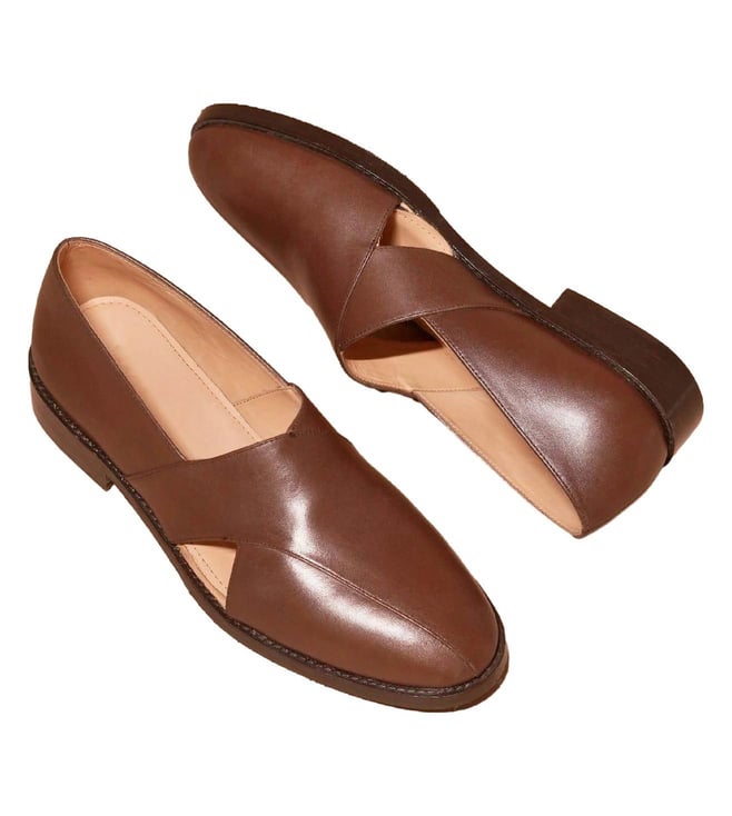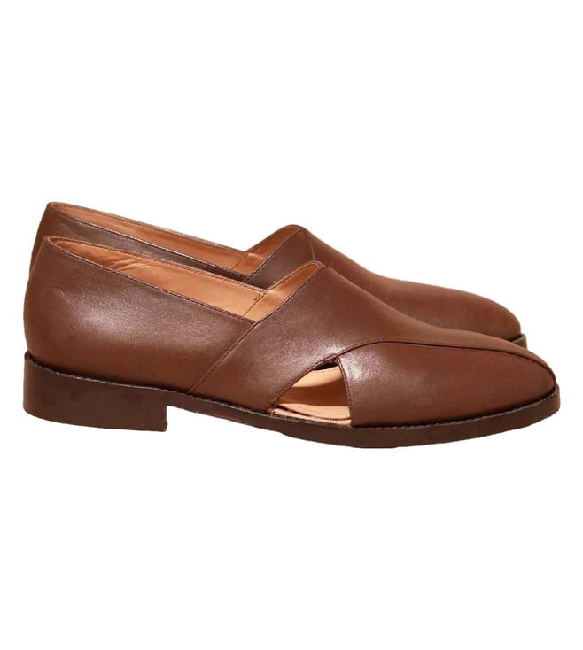 The Pesha Scarpo Marrone is a refined fusion of traditional Peshawari design with a sleek, modern silhouette crafted for those who appreciate heritage elegance wrapped in a contemporary form. Made from premium full-grain brown leather, the shoe features signature Peshawari vamp detailing, paired with a rich contrasting beige lining that enhances its earthy sophistication.
