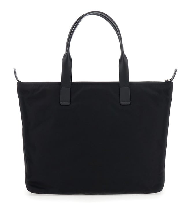 Black Logo-Plaque Tote, zip closure, 1 compartment, front logo, solid, dual carry handles. With its timeless design and practical features, this bag is a must-have accessory for the modern woman on-the-go.