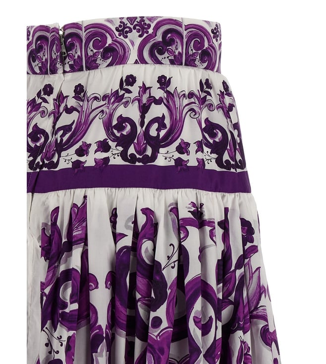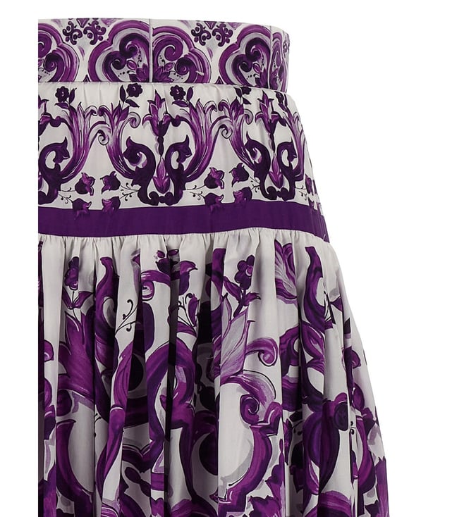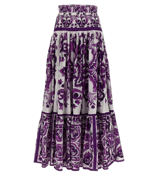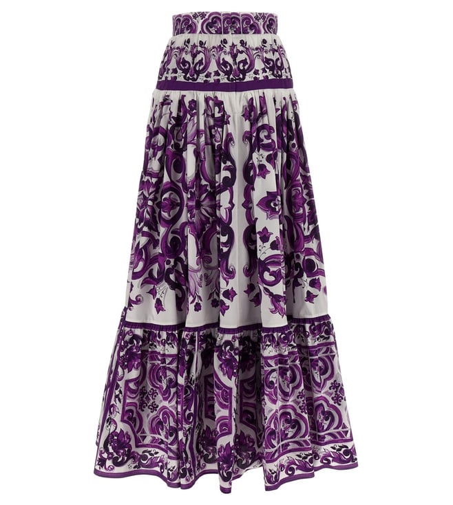 Elevate your wardrobe with the Dolce&Gabbana Purple Floral skirt. Designed with long skirt in cotton poplin with all-over majolica print, pleats and flounces on the hem, unlined, back zip closure. true to size fit, these trousers combine comfort and sophistication for everyday wear. Products purchased from Darveys are supported exclusively by the warranty/exchange policies of Darveys and its partner boutiques. Brand owners and their channel partners are not responsible for exchange/warranty services for items purchased through Darveys.