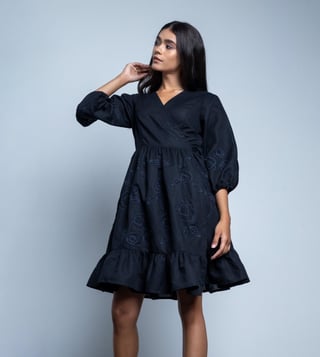 Stand out in the crowd with this dress. The wrap-around applique and an embroidered dress come with a frilled hem. The fabric is collected, cleaned and panelled to create this style. This piece may come with an extra embroidery or patch but the overall look and feel of the piece are not changed. This piece is a part of a limited edition collection. It has been prepared with precision using premium quality upcycled cotton. Disclaimer: Product colour may slightly vary due to photographic lighting sources. Country Of Origin - India.