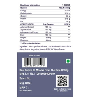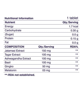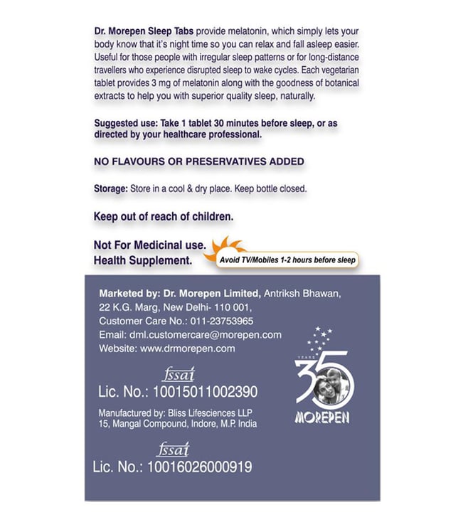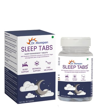 Dr. Morepen sleep tabs support the sleep to wake cycle by adjusting the body clock through melatonin that reacts to darkness & wakes you up in the morning when light is up. It ensures reduced sleep disturbances by improving the quality of sleep and decreased nocturnal awakening. Atamansi extracts act as a brain tonic and helps improve memory and brain functions by preventing cell damage due to antioxidant properties. Tager extract helps in reducing anxiety and improving sleep as it relaxes the central nervous system due to its sedative and anxiolytic properties.