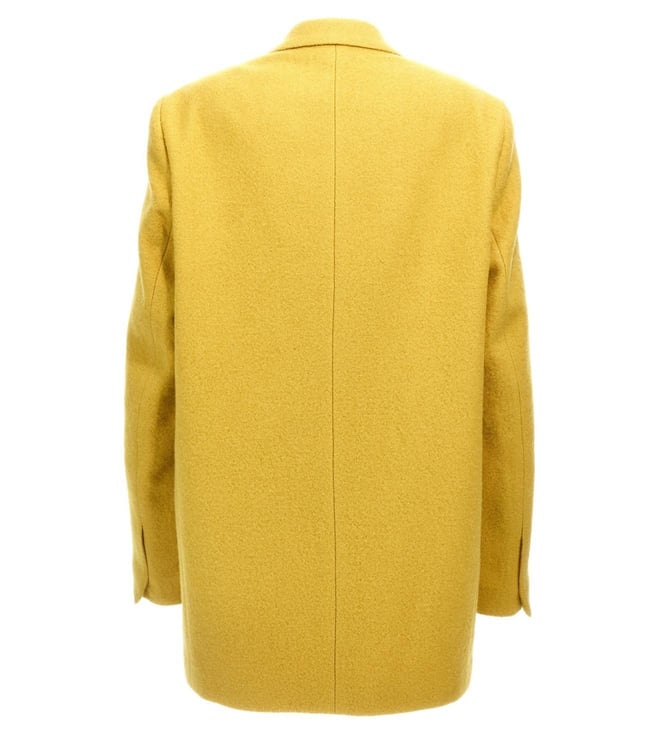 Radiate confidence and elegance with this striking yellow blazer, crafted from 100% premium wool. Its solid hue exudes a vibrant charm, perfect for making a bold statement. The long sleeves and classic lapel collar add a touch of timeless sophistication, while the tailored fit ensures a flattering silhouette. Designed for the modern woman, this blazer features a sleek closure that seamlessly blends functionality with style, making it an essential addition to any wardrobe.