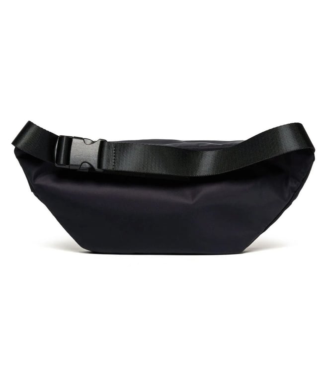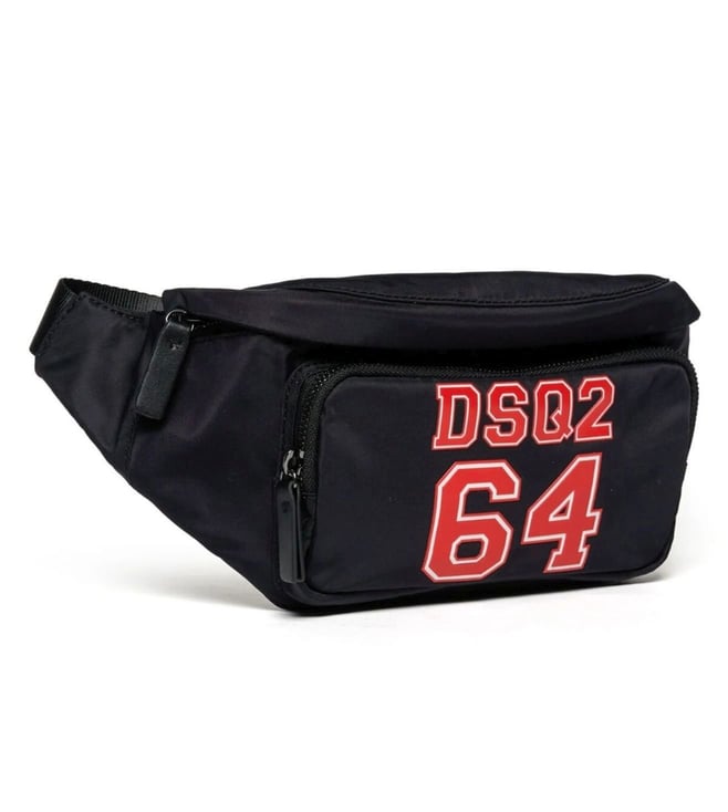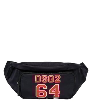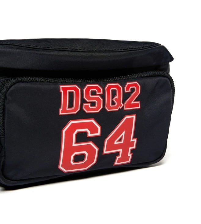 This is a black DSQUARED2 belt bag with a bold, sporty design. The front features dsq2 in large red and white varsity-style lettering, along with the number 64, giving it a collegiate aesthetic. It is made of a durable, water-resistant material, likely nylon or polyester, ensuring longevity and practicality.