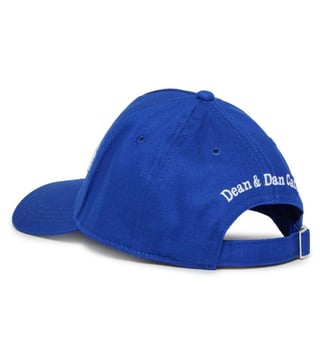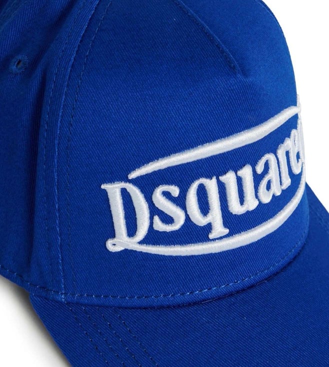 This is a royal blue DSQUARED2 baseball cap featuring a bold and sporty design. The front showcases an embroidered dsquared logo in white, styled in a curved, dynamic font. The cap is made from a durable fabric, likely cotton or a cotton blend, ensuring comfort and breathability. It has a curved brim for sun protection and stitched panels with ventilation eyelets for added airflow. The back likely features an adjustable strap for a customizable fit. This cap adds a stylish, streetwear-inspired touch to casual outfits.