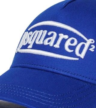 This is a royal blue DSQUARED2 baseball cap featuring a bold and sporty design. The front showcases an embroidered dsquared logo in white, styled in a curved, dynamic font. The cap is made from a durable fabric, likely cotton or a cotton blend, ensuring comfort and breathability. It has a curved brim for sun protection and stitched panels with ventilation eyelets for added airflow. The back likely features an adjustable strap for a customizable fit. This cap adds a stylish, streetwear-inspired touch to casual outfits.