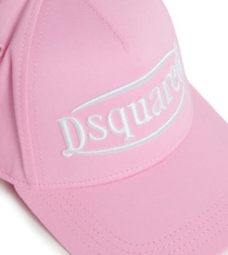 Pink DSQUARED2 baseball cap featuring a bold and sporty design. The front showcases an embroidered dsquared logo in white, styled in a curved, dynamic font. The cap is made from a durable fabric, likely cotton or a cotton blend, ensuring comfort and breathability. It has a curved brim for sun protection and stitched panels with ventilation eyelets for added airflow. The back likely features an adjustable strap for a customizable fit. This cap adds a stylish, streetwear-inspired touch to casual outfits.