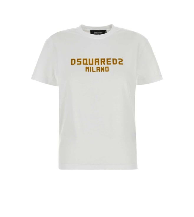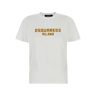 The Dsquared2 White Just Right Fit D2 Milano T-Shirt is a chic blend of comfort and style, tailored for the modern woman. Crafted from 100% premium cotton, this regular fit tee offers a soft, breathable feel, perfect for any occasion. Its crisp white hue exudes elegance, while the minimalist design ensures versatility. The subtle yet sophisticated pattern adds a touch of flair, making it a wardrobe staple. Ideal for pairing with jeans or skirts, this t-shirt is a testament to timeless fashion.