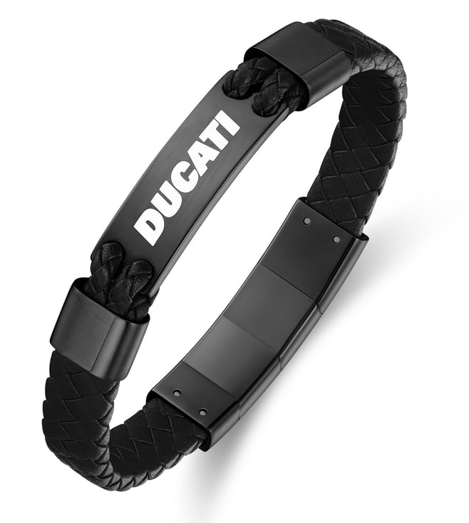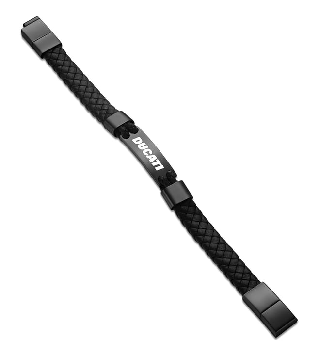 Thick black braided leather gives the DUCATI expedition bracelet its weight and presence. At the centre, an ion plated black metal plaque bears the iconic DUCATI signature anchoring the piece in function and identity.
