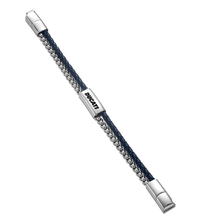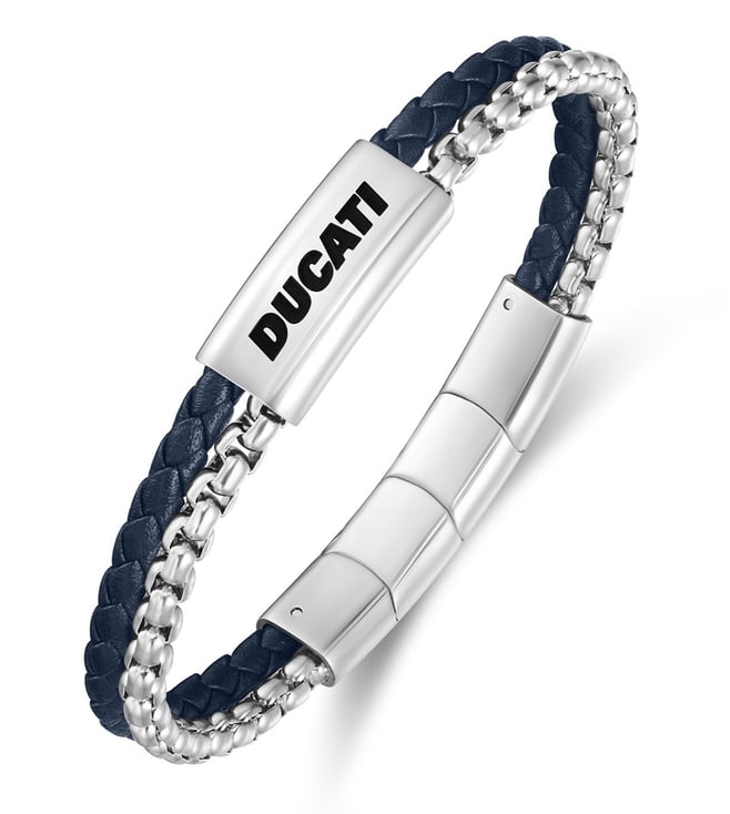 DUCATI drifter bracelet pairs stainless steel with navy leather in a design that has all control, no compromise. At its centre, an etched DUCATI plaque anchors the piece confident, unmistakable. This is not design that follows. It leads.