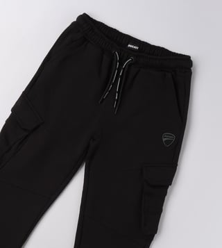 Keep your young racer comfortable and stylish with these official Ducati licensed cargo joggers. Designed in classic black, these joggers feature multiple utility pockets for a trendy, functional look, along with the Ducati logo for a sporty touch. Crafted from 85% Cotton 15% Polyester fabric, they come with an adjustable drawstring waist and ribbed ankle cuffs for a perfect fit. Ideal for casual wear, sports practice, or travel days.
