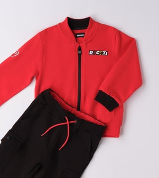 Add a sporty edge to your child’s wardrobe with this official Ducati licensed tracksuit set. The bright red zip-up jacket features Ducati branding on the chest and a bold racing-inspired patch on the back, bringing true motorsport vibes. Paired with contrasting black jogger pants designed with Ducati graphic detailing, this set ensures both comfort and style. Made from 100% cotton fabric, it’s perfect for play, travel, or casual outings.