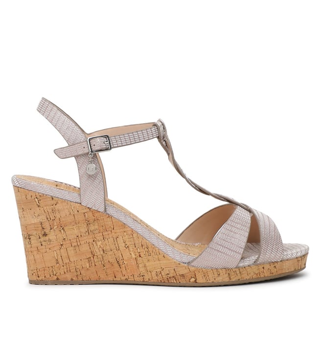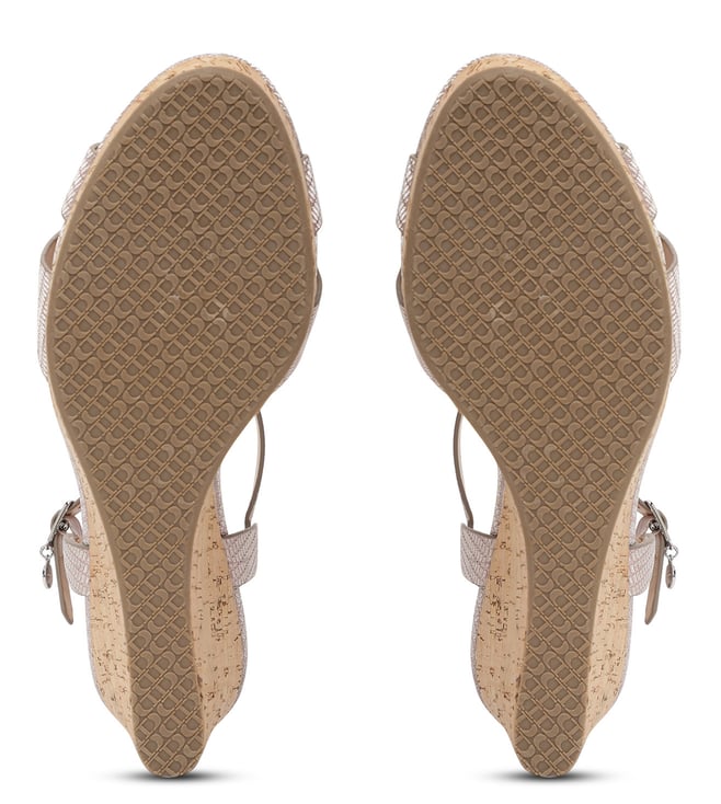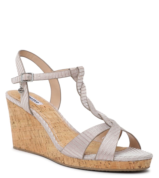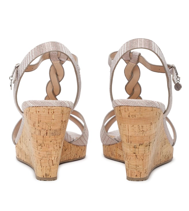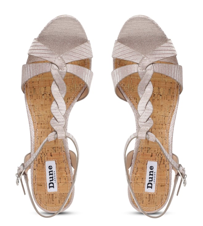 Dune London Women's KOALA Cork Heel Shimmer Plait T-Bar Rose Gold Ankle Strap Wedges