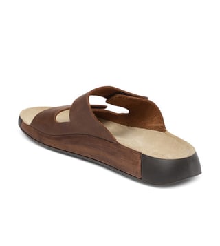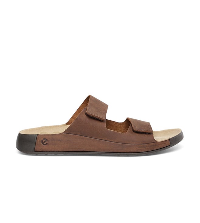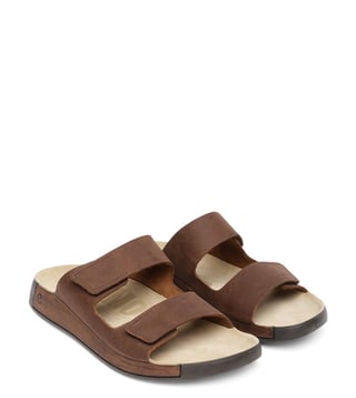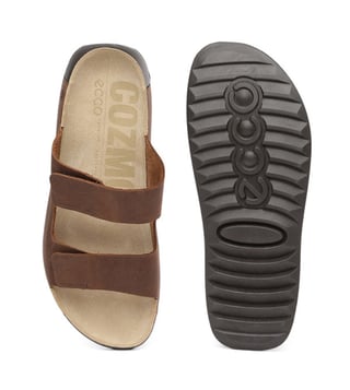 ECCO Men's Cozmo Potting Soil Slide Sandals feature FLUIDFORM construction, a soft PU midsole, and adjustable straps. They provide Scandinavian style and comfort for warm-weather wear.