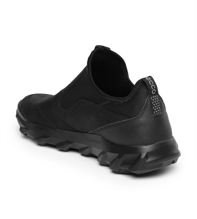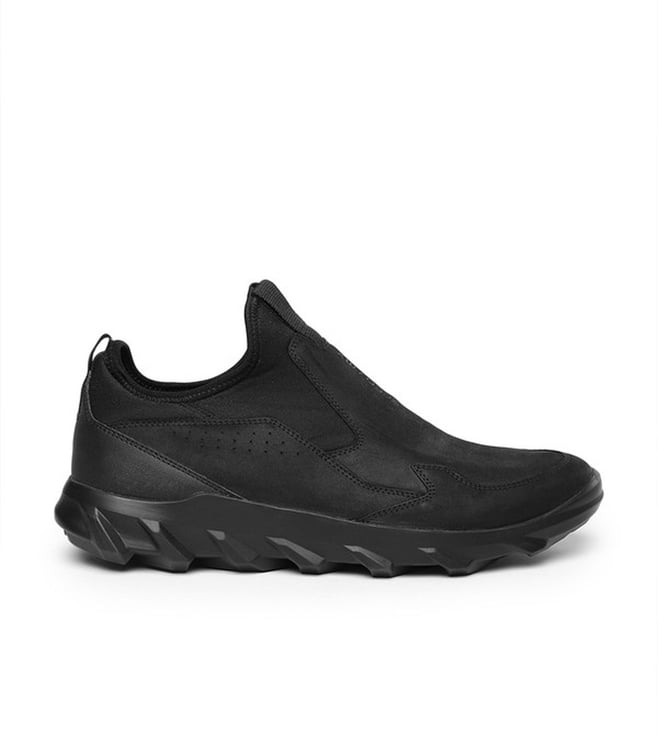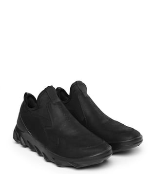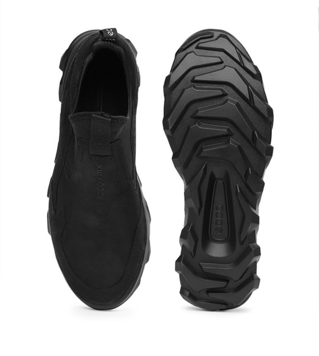 ECCO Men's Mx Black Slip-On Sneakers feature a motocross-inspired outsole and stretchy sock-like fit. With ECCO oil nubuck leather, they offer comfort, style, and grip for trails or streets.