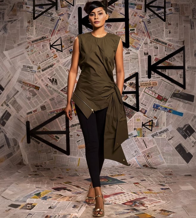 Grey Chambray with Bandhgala Feature Short Kurta with Side Slit Overlap Pants