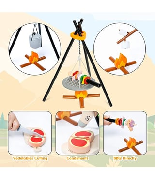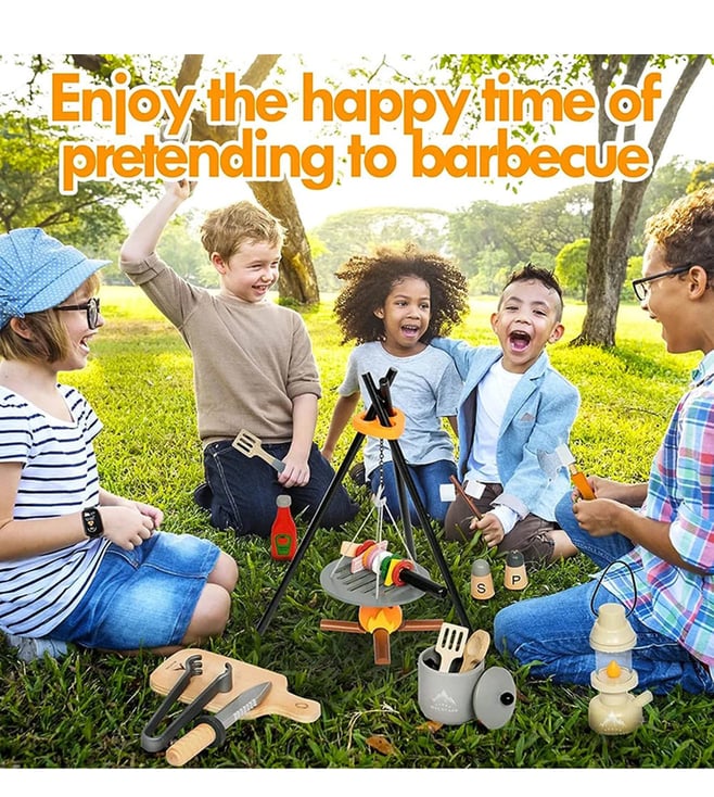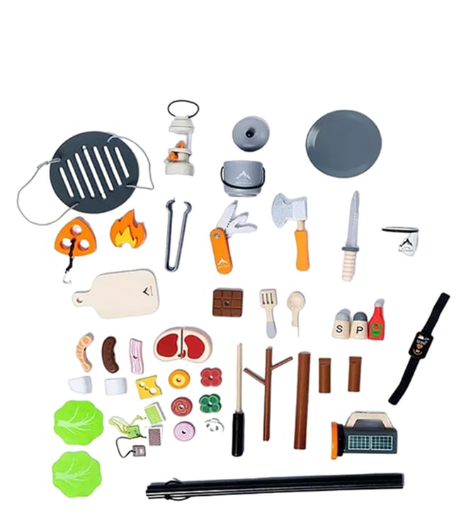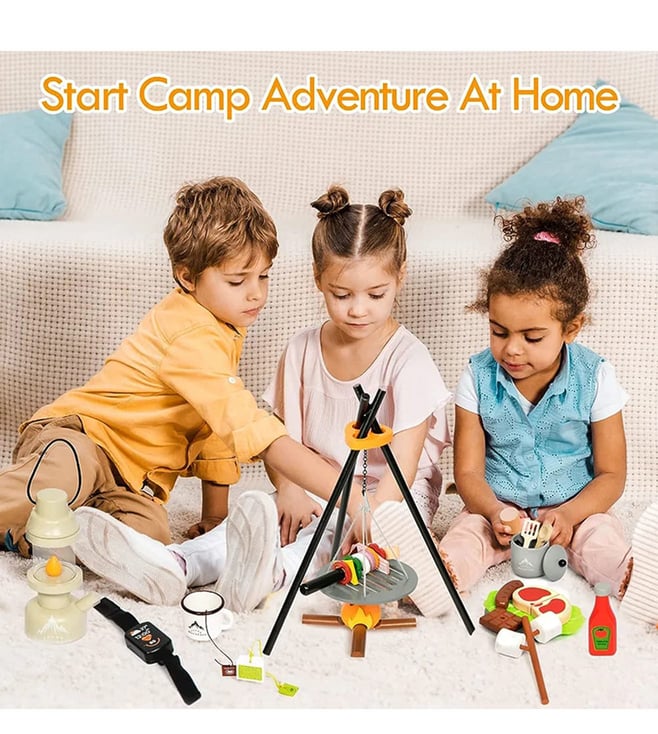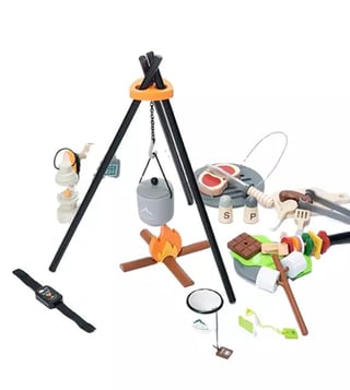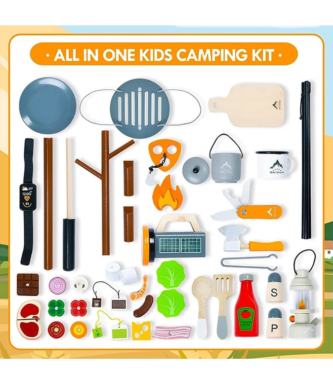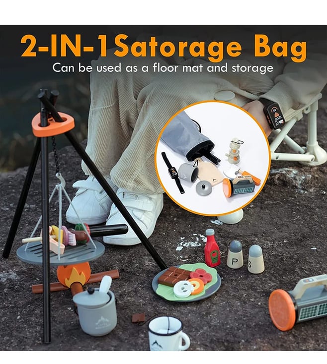 Immerse your little one in the great outdoors with the camping set with a portable kid's camping bag. The camping toy and fire features include a mat storage bag, campfire, stand, cap, lid, watch, two-in-one lantern-flashlight, chopping board, knife, foldable fork and knife, utensil kit, lantern, and eleven different food pieces. This camping set with the bag is sure to pique your kid's attention and curiosity.