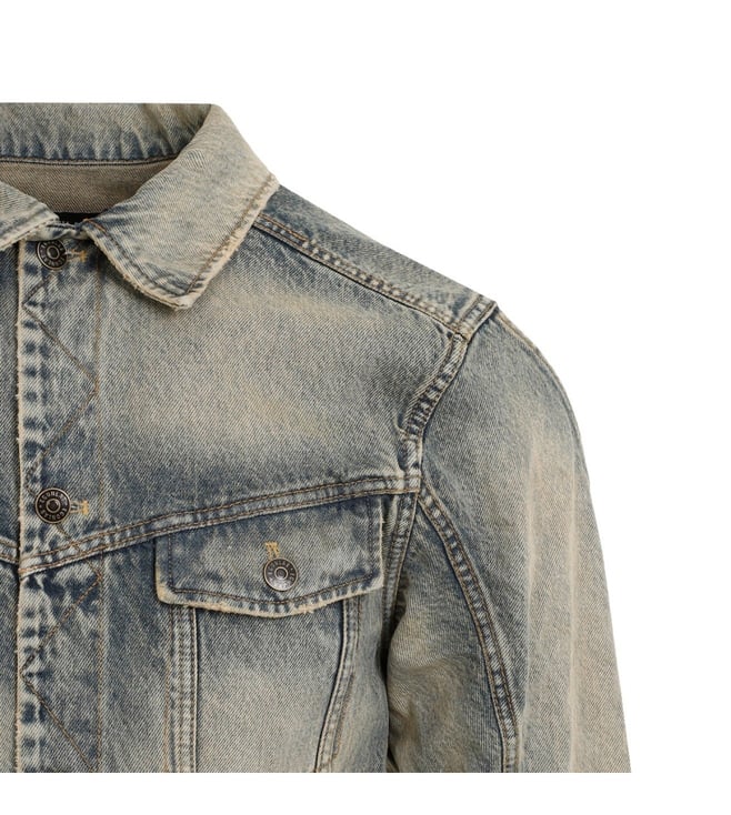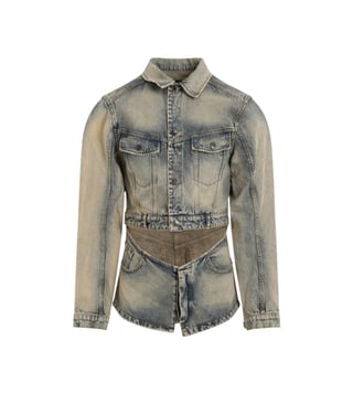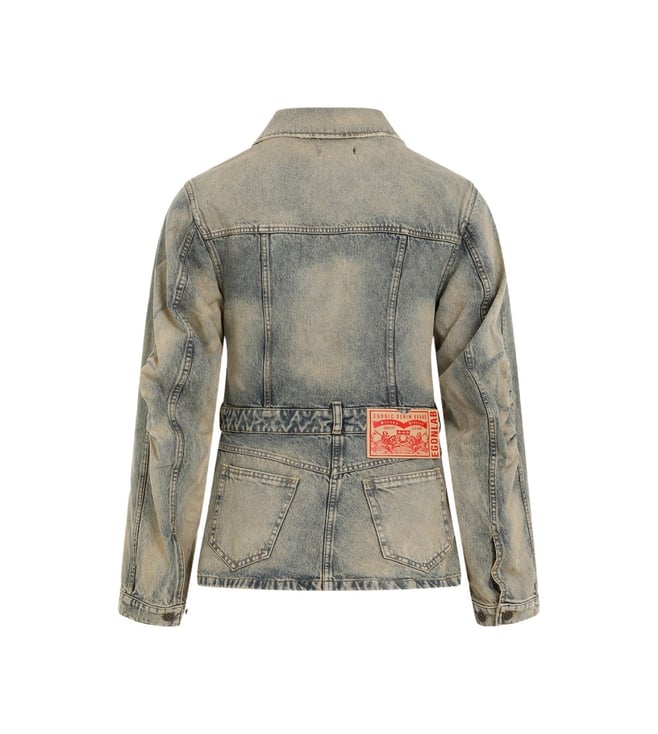 Elevate your style with the Egonlab Denim Faded Oversized Fit Jacket. Egonlab cutout blue cotton denim jacket. Crafted from stonewashed blue cotton denim, pointed collar, button closure on the front, two flap pockets with button, front cutout detail, dropped shoulders, long sleeves, belt loop on the waist, branded leather label on the back, 5pockets skirt design, buttoned cuffs.