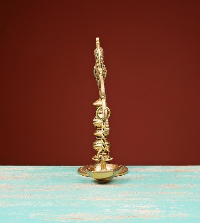 Diya signifies purity, goodness, good luck and power. Bring home this beautiful brass lamp with hanging diya to keep in your pooja room or decorate your house. It adds a touch of elegance to your space. Slight variations in this handmade product is beyond control and is not considered as defects and only add to the beauty of the product. Disclaimer: All other items in the image are only for display purposes and will not be a part of the delivery content. Country Of Origin - India.
